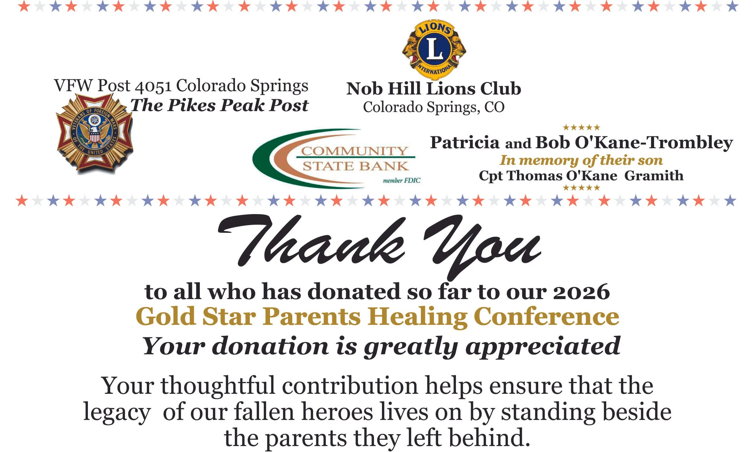 GOLD STAR MOTHER’S OF AMERICA: Pikes Peak Chapter American Gold Star Mothers-Colorado Springs * MARINE CORP LEAGUE: Windsor Marine Detachment * Union Colony Marine Corp League Greeley * VETERANS ASSOCIATIONS: Surface Creek Veterans Association-Cedaredge * BLUE STAR MOTHER’S OF AMERICA: Chapter 1 Durango * Chapter 4 Grand Junction * Chapter 6 Alamosa * VETERANS OF FOREIGN WARS: Post 2461 Denver * Post 8661 Conifer * Post 9565 Broomfield * VETERANS OF FOREIGN WARS MEN’S AUXILIARY: Post 2461 Denver * Post 4051 Colorado Springs * Post 9644 Denver * VETERANS OF FOREIGN WARS LADIES AUXILIARY: Post 336 Ordway *Post 9058 Nucla * Post 1411 Lake George * Post 2121 Greeley * Post 2411 Las Animas * Post 2461 South Denver * Post 2585 Johnstown * Post 2788 Penrose * Post 2797 Lakewood * Post 3411 Kit Carson * Post 3228 Monte Vista * Post 4031 Durango * Post 4051 Colorado Springs * Post 4171 Golden * Post 5061 Denver * Post 5812 Pueblo West* Post 6331 Aurora * Post 6624 Evans * Post 7945 Thornton * Post 8661 Conifer * Post 9058 Nucla * Post 9565 Broomfield * Post 9644 Englewood * 11411 Florissant * AMERICAN LEGION POSTS: #1 Denver * #5 Colorado Springs * #10 Boulder * #78 Rifle * #143 Bayfield * 151 Commerce City * #160 Byers * #178 Lakewood * #180 Keensburg * #1980 Woodland Park * #9-11 Palmer Lake * #2001 Evergreen * #2002 Brighton * AMERICAN LEGION AUXILIARY: Unit #1 Denver * Unit #4 LaPorte * Unit # 5 Colorado Springs * Unit #21 Golden * Unit #23 Aurora * Unit #53 Monte Vista * Unit #66 Akron * Unit #76 Fort Morgan * Unit #78 Rifle * Unit #89 Hayden * Unit #119 Estes Park * Unit #151 Commerce City * Unit #160 Aurora * Unit #178 Lakewood * Unit #189 Yampa * Unit #193 Denver * Unit #209 Colorado Springs * CIVIC GROUPS: Durango Lions Club * Bayfield Lions Club * Durango Elks No.507 * Southwest Republican Women * The Wells Group of Durango * CHURCHES: St. Columba Catholic Church (Durango) * Christ The King Lutheran Church (Durango) * BUSINESSES: Pine River Valley Bank (Bayfield) * Durango Coffee Company * Hood Mortuary (Durango) * United Methodist Thrift Shop (Durango ) * Benjamin Morgan Insurance Agency * Better Water Company rocky Mountain Bottled Water * Desperados Bar & Grill (Durango) * Kirkpatrick Enterprises (Durango) * First National Bank of Durango * Kessee Motor Company (Cortez) * Double Tree Hotel of Durango * Duresky Insurance Company (Durango) * Nelsen Electric (Durango) * ABATE of Durango * Law Tigers * Management Momentum LLC * Markley Motors * Mountain Wealth Management * Orthopedic & Spine Center of the Rockies * R-N-R Supply Inc. * Summers Auto Repair * The Barth Investment Partnership, LLP * The Craig C. Campbell Insurance Agency * The Shawn M. Gordon Memorial * INDIVIDUAL DONORS: Judi Mora * Dorothy and Frank Parr * Walter and Joyce Turner * General and Mrs. Ronald Fogleman * Karen Hartong * Warren and Eunice Kerzon * Barbara Moulds * Edward and Joanne Brennan * Guy Johnson * B & L Goins * Mrs. Esther Johnson * Roy and Patricia Roberts * Karl and Marie Zeller * John and Debbie Seglund * James G. Thomas TTEE * Angelique and Francisco Barron * William and Carolyn Plested * Gail and Norman Stern * John and Eliane Viner * Frank (Art) and Mary Batman * Walter and Joyce Turner * Margaret Vitittow * Kirk and Linda Theige * Elyse Klingener * Kenneth and Johanna Fusco * Esther L. Johnson * Edward Farrington * Charles and Patricia Muckenthaler * Teresa Porter * Beverly and Harvey Tripple * David and Judy Christensen* Beverly Cummiskey * Kathleen Beiting * Clay and Kathy Hill * Julie Durst * John and Pam Hermon * Ruth Durant * Rafael Sanchez * John and Lori Tripp * Janet Kester * Bonnie Gordon * Linda and Gene Shaw * Barb Herbel Hendricks * Mary LoVerde* Rick and Robin Fort * Vicki Dagen Hanby * Tom and Marily Majors * Mary Witt * Sheri Cole * Larry Leeman * Sally and Greg Vanbuskirk* Joe LoVerde * Barry and Susan Hillegas * Brenda Abdilla * Pam and Jim Reitz * Hugh Schexnider * Kathy and Clay Hill * Jay and Betsy Schaefer * Brandsma Family Fund * Susan E. Wagner * Andrew D. Moore * Baraba and Carter Sales * Barb and Herbel Hendricks * Barry and Susan Hillegas * Beverly and Harvey Tripple * Beverly Cummiskey * Bonnie Gordon * Case and Jessica Brown * Charles and Mary Ellen Metcalfe * Chris McClain * Clay and Kathy Hill * Danny Barnhart * David and Judy Christensen * David Moore * Dean and Nancy Burchfield * Frances Heintzelman * Hugh Schexnider * J Pruter-Scherlis * James and Sheri Zasowski * James and Pamela Reitz * Janet Kester * Jennifer Lamb Clarke * Joan Norris * Joe LoVerde * John and Lori Tripp * John and Pam Hermon * Joseph and Eilen Concilio * Julie and Clifford Stockdill * Julie Durst * K and L Waddell * Karen Norris * Kathleen Beiting * Kevin and Janet O’Brien * Larry Leeman * Linda and Gene Shaw * Linda V. Cash * Linda Verhoeven * Lucille Poydock * Margaret Gibson * Margie and Douglas Kidd * Mary Biggers * Mary LoVerde* Mary Witt * Michael and Coutney Barth * Molly O’Brien and Kyle Whitehair * Priscella Moore * Rafael Sanchez * Raymond and Vicki LaLone * Richard and Cathryn Hillbrand * Richard * Elizabeth Rush * Richard and Lisa Bellmar * Richard and Brenda Duffy * Rick and Robin Fort * Ruth Durant * Sally and Greg Vanbuskirk * Sheri Cole * Tom and Marilyn Majors * Toni Kimble * Vicki Dagen Hanby * Wendy Johnson